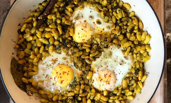 Learn to make baghali ghatogh (dill-scented lima beans topped with poached eggs) paired with zireh polo kateh ba tahdig (Persian rice with crispy tahdig)!