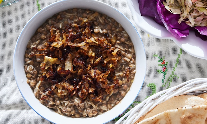 Learn to make mujaddara (a savory vegan lentil dish topped with crispy fried onions) and salatet malfoof (a refreshing cabbage salad)!