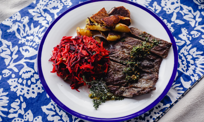 Learn to make entraña a la parilla (grilled Argentinian skirt steak) with chimichurri, papas al horno con hierbas (roasted potatoes with herbs), and a bright and tangy salad made from beets, carrots, and onions!