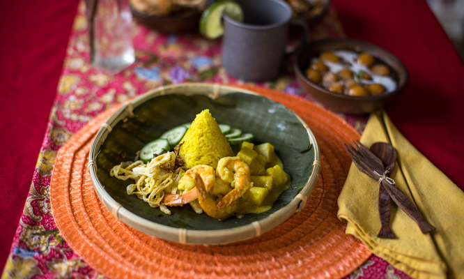 Learn to make gulai udang ala padang (an aromatic coconut curry with shrimp and potatoes) paired with nasi kuning (a festive yellow rice dish)!