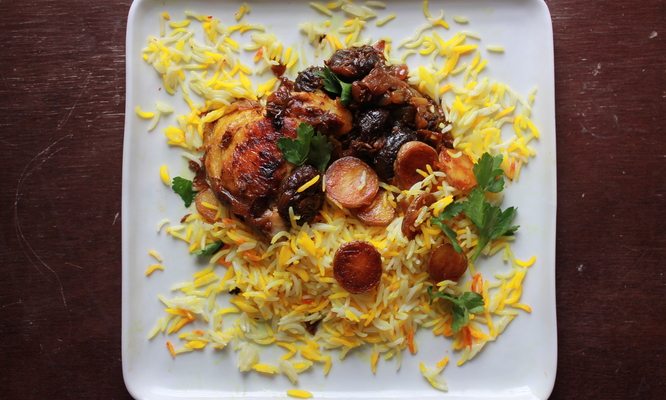 In this 2.5 hour interactive online experience Mab will guide you through making two of her family recipes. First Mab will show you how to prepare aloo morgh-e beround-e Parvin joonam (a rich and fragrant chicken dish made with onions, prunes, saffron, rosewater, cumin, turmeric, and cinnamon). You will also learn how to make kateh polo zafran ba tahdig sibzamini (perfectly steamed saffron rice with a crispy potato tahdig)..