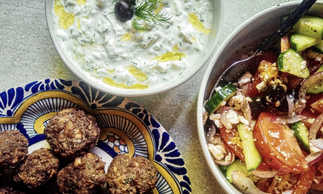Learn to make fragrant keftedes (Greek meatballs), tzatziki sauce, and xoriatiki salata (a traditional Greek salad)!