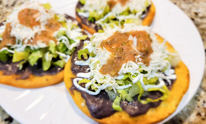 Learn to make vegetarian black bean tostadas topped with tangy crema and spicy salsa roja, along with zesty esquites (flavorful corn kernels in broth topped with lime, mayo, cotija cheese, and chili powder) on the side!