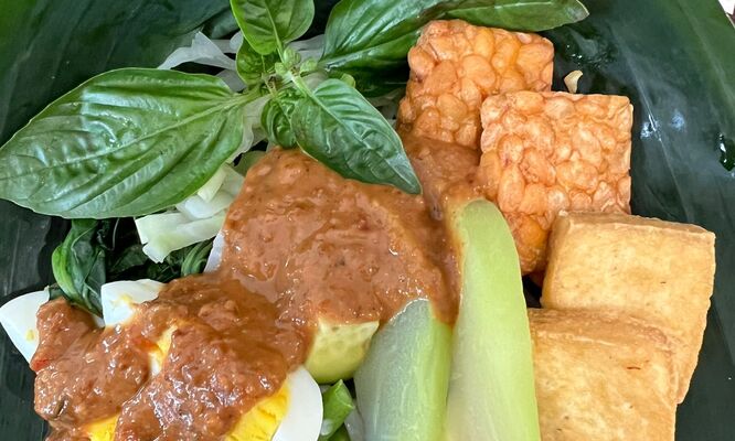 Learn to make Javanese pecel (a traditional salad dish composed of a variety of vegetables such as spinach, chayote, bean sprouts, long beans, cabbage, and cucumber, served with a peanut sauce), tempeh tofu bacem (a beloved Javanese dish with tempeh and tofu simmered in a sweet and salty coconut water broth before being fried), and nasi jagung (a nutty and delicious jasmine rice flavored with coarse cornmeal)!